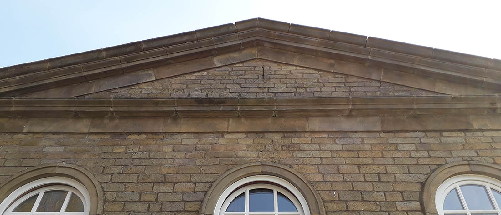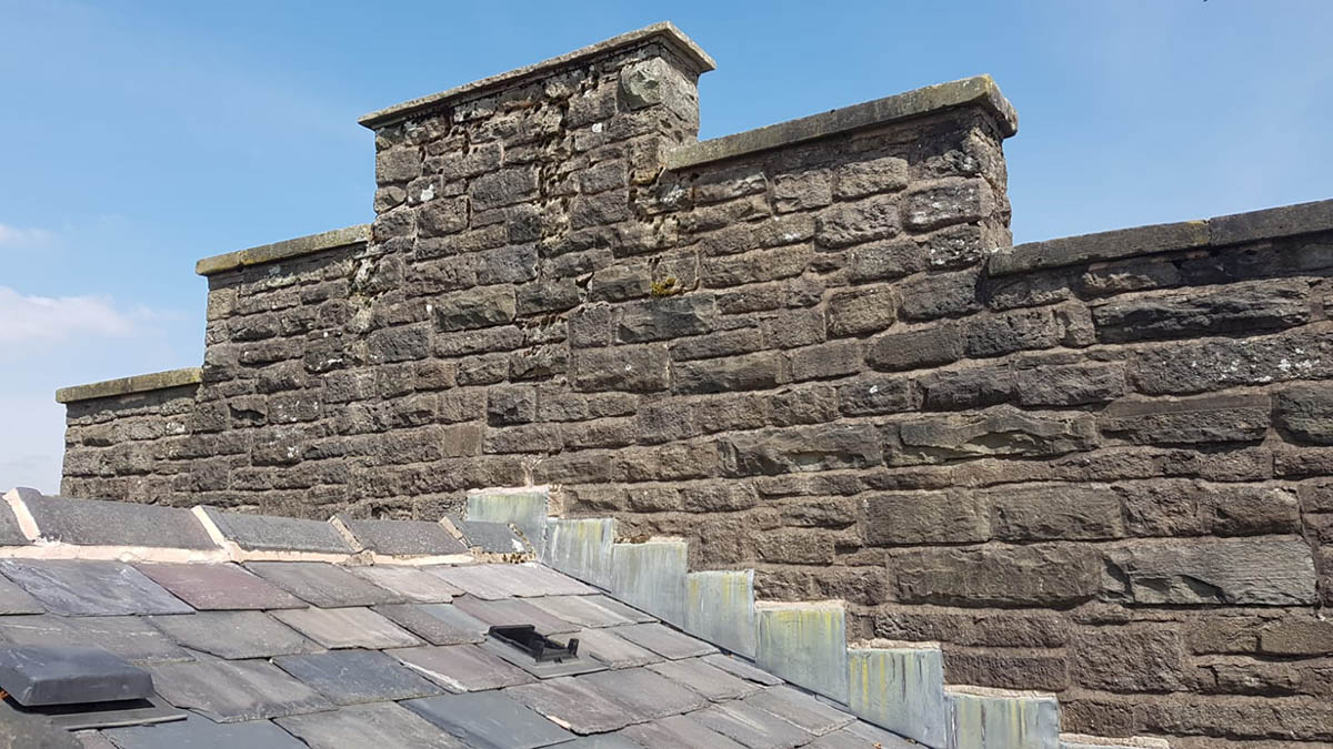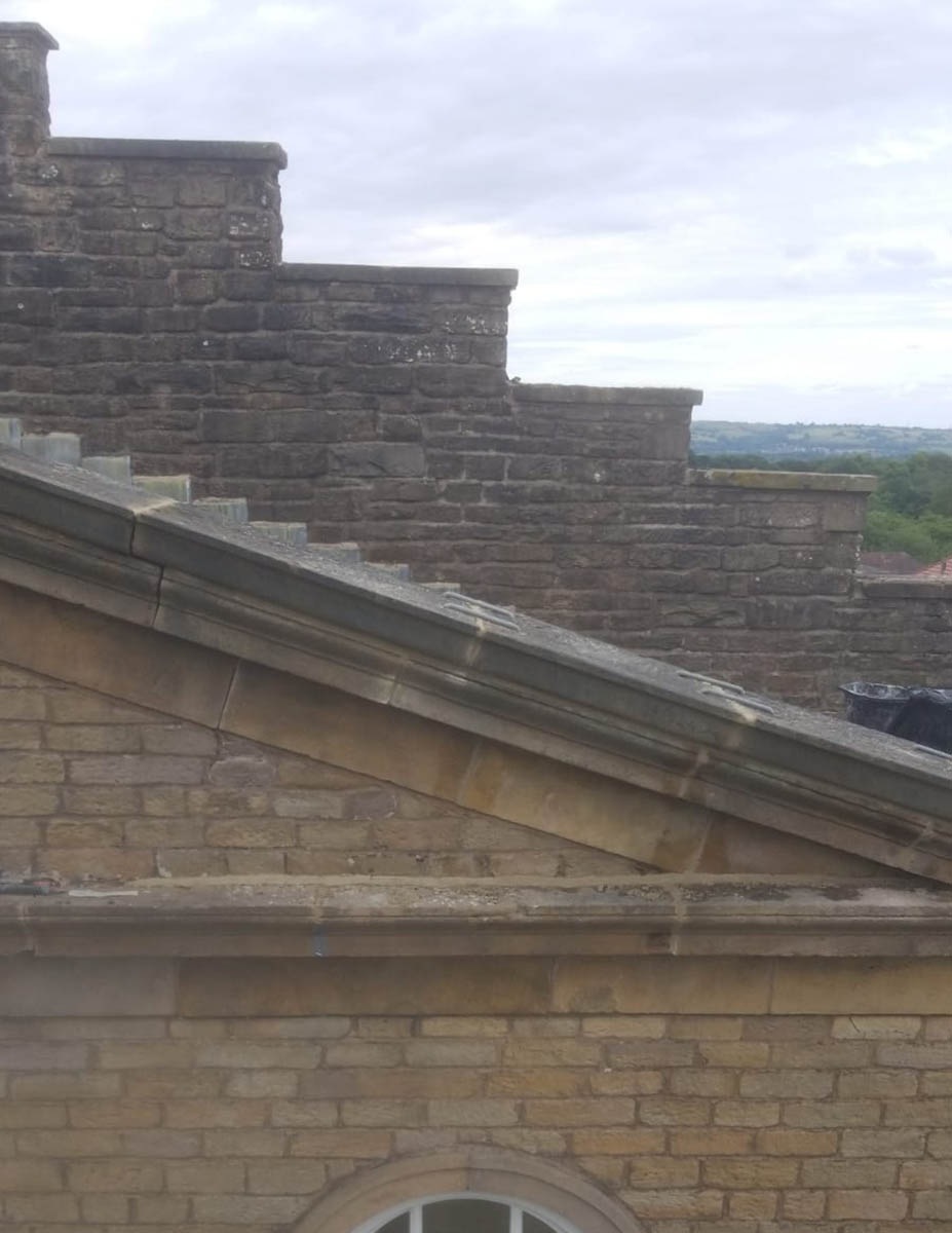 At the front of the property is an apex of large decorative stone copings. Over time, the lime mortar between these copings had deteriorated and completely washed away with weathering. To lift the large heavy copings to assess the condition of materials beneath would have been a significant undertaking. Lead toppings were discussed as an option, though it was initially agreed for lime mortar to be packed and filled between the copings as an economic first stage repair.