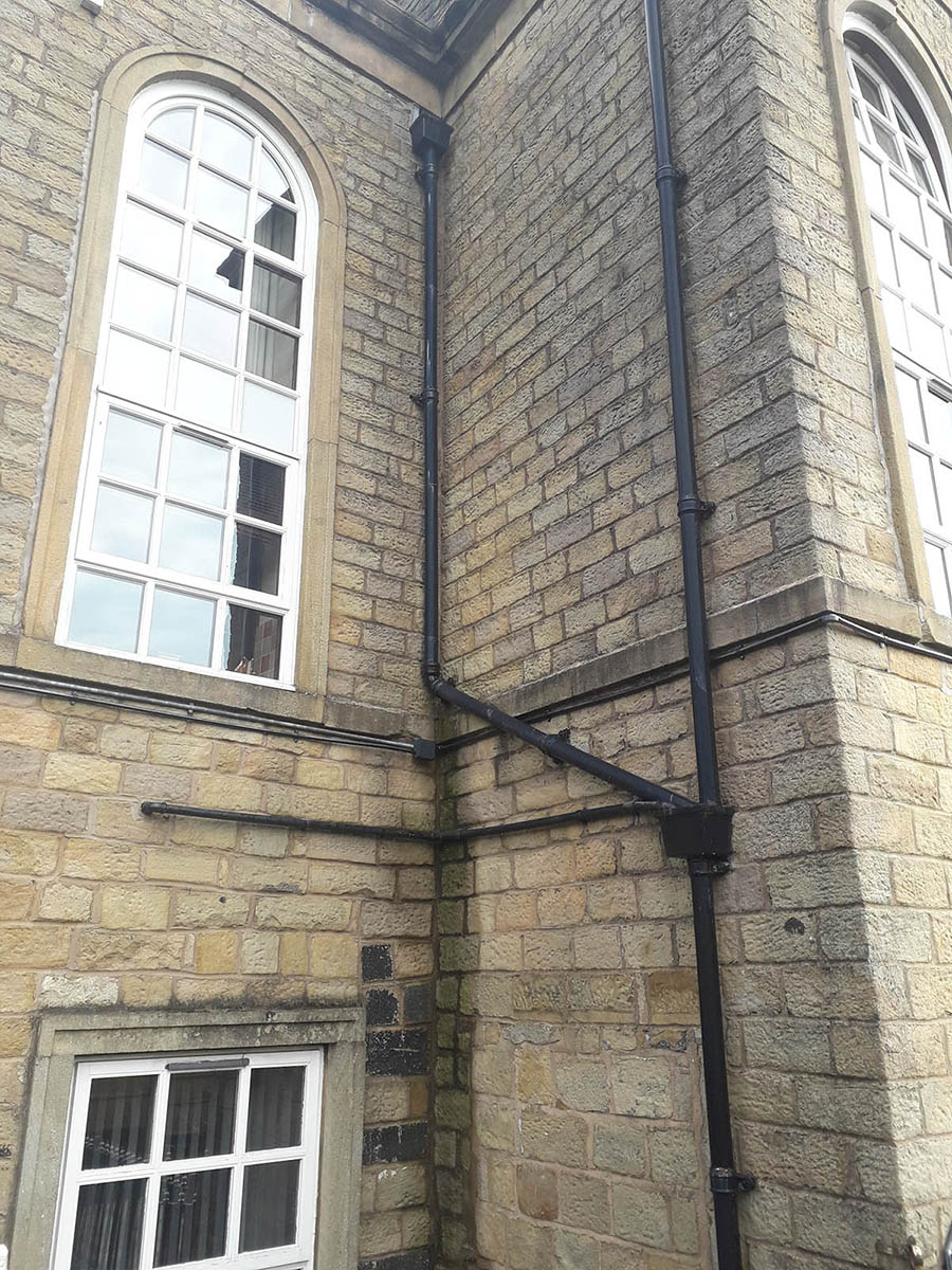 The front gutters were leaking, so hoppers and downpipes were rodded and cleaned to prevent overflow.