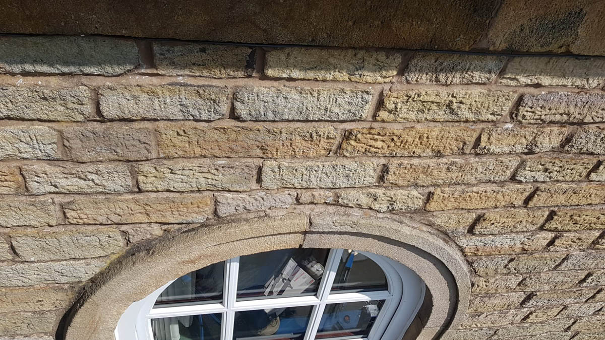 The front of the property features three large arched windows. The extruded stone window detail was flat, which had allowed water to gather and wash away mortar at the stone wall. An angled lime mortar fillet was created allowing water to run away from the building.