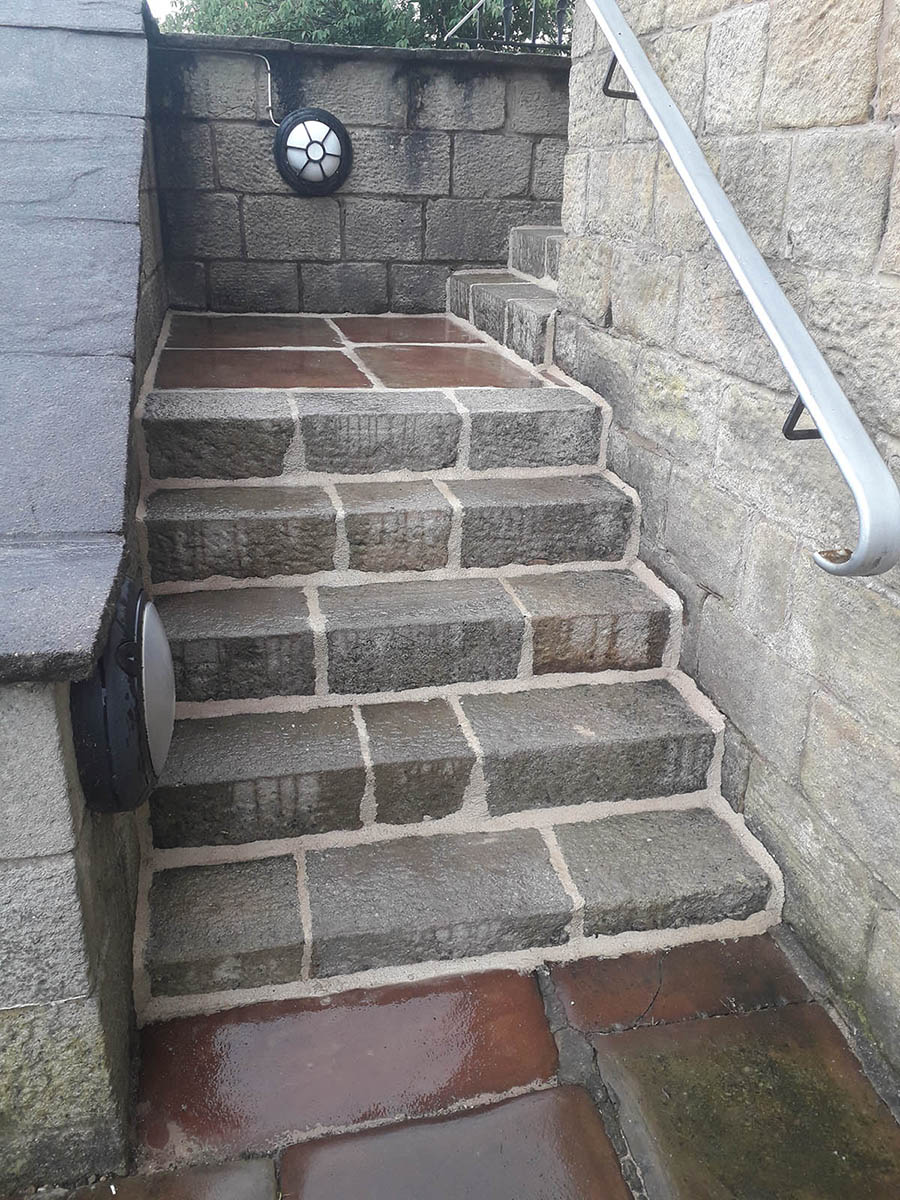 Not related to water ingress, a flight of stone steps was also repointed in lime as part of the works as the previous mortar to the yorkstone and stone had failed. The debris was cleaned away and a durable lime mix was applied which made access easier on even surfaces.